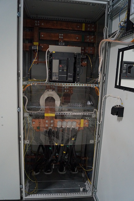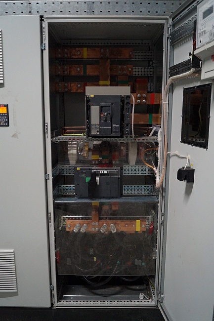 - Описание схемы: два рабочих ввода, секционированная система сборных шин, секции имеют связь посредством секционного выключателя, АВР (автоматический ввод резерва) с восстановлением (если на отключенном вводе появляется напряжение, то с выдержкой времени он включается, а секционный выключатель отключается). Вводные и секционный выключатели – Compact NS с мотор-редукторами (Schneider Electric);