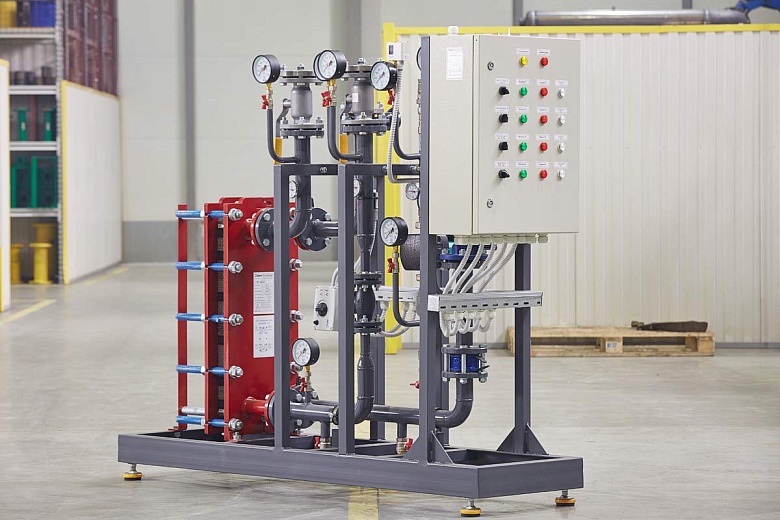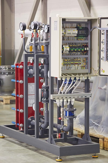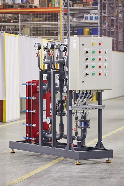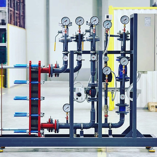 Представленный блок ГВС входит в состав блочного теплового пункта полной заводской готовности. Основным компонентом данного изделия является разборный пластинчатый теплообменник производства ООО «Брант», имеющим патрубки из нержавеющей стали для удобства присоединения наружных и внутренних коммуникаций. Блок ограничивается запорной арматурой с ответными фланцами для подключения труб. Для поддержания температуры ГВС используется регулирующий клапан с электроприводом, а также датчики температуры теплоносителя фирмы Danfoss. Для работы циркуляционной линии установлен насос фирмы Wilo с необходимой обвязкой. Шкаф управления укомплектован элементами фирмы Schneider Electric, включая контроллер Modicon M171, функционирующем на программном обеспечении, разработанном специалистами ООО «Брант». В данном варианте комплектация шкафа позволяет поддерживать и контролировать параметры как в системе ГВС, так и в системе отопления. При этом выполнен полный электромонтаж в границе блока, что обеспечивает максимальную готовность продукта к запуску. Блок комплектуется измерительными приборами одного из ведущих российских производителей «Росма».Установленная мощьность 200 КВт. Оборудование располагается на единой раме с опорами, которые позволяют регулировать высоту блока. Компоновка блока прорабатывается индивидуально под каждый объект. |