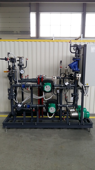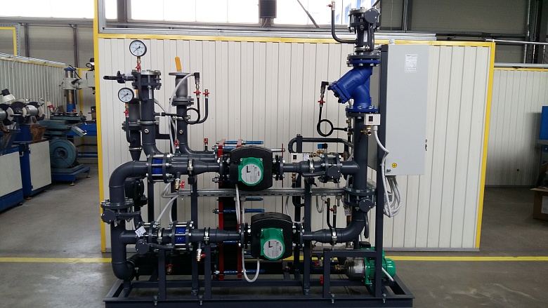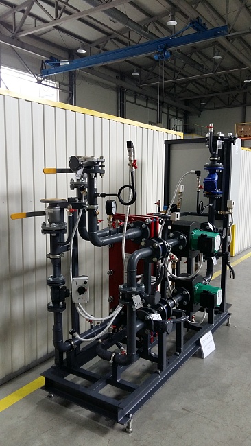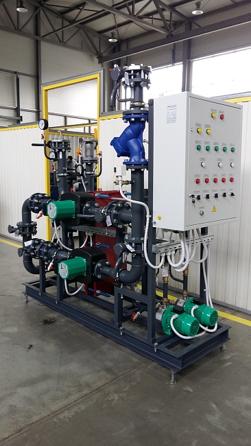 Управление насосами циркуляции отопления реализовано с помощью преобразователей частоты, установленных в шкафах управления тепловым пунктом. Стандартное исполнение блоков с полным электромонтажом в границах блоков. Шкафы управления смонтированы на раме блоков отопления. На блоках ГВС оборудование расключено в клемную коробку с промаркированными кабелями и клемником, в соответствии с электрической схемой из комплекта технической документации, входящей в состав поставки. |